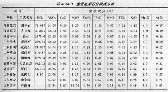 礦石類型單一,均為紅色中—粗粒花崗巖,礦石具塊狀構造、花崗結構,少數具有嵌晶結構;礦物成分較簡單:長石含量約65%、石英含量約30%、黑云母含量2%~3%;副礦物有白云母、石榴子石等。 礦石化學成分:SiO2 73.4%、TiO2 0.01%、Al2O3 14.83%、Fe2O3 0.71%、Na2O 4.85%、K2O 3.34%。
