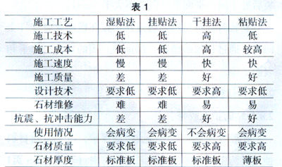 石材http://www.stonebuy.com/裝飾工程根據飾面石材http://www.stonebuy.com/規格大小、施工設計要求、施工部位不同,施工方法可分為濕貼法、掛貼法、干掛法、粘貼法、濕貼法主要是用水泥砂漿粘貼;掛貼法是用鋼絲將石板掛在已安裝于墻上的鋼筋網之上,調校平整后灌入水泥砂漿;干掛法是領先掛件、螺栓直接固定在墻面或鋼架上;粘貼法主要是用工程膠粘貼。它們的優缺點歸納如表1: