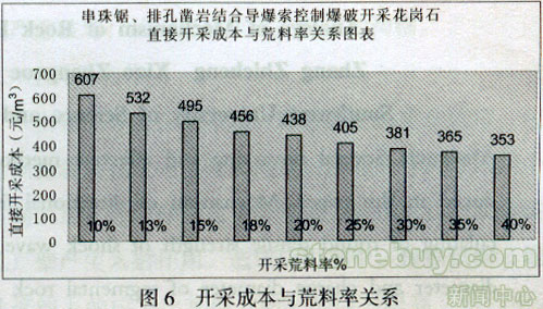 串珠鋸配合排孔鑿巖結合導爆索控制爆破開采,分享體體積、開采荒料率和直接開采成本見表3,開采成本與荒料率的關系見圖6.