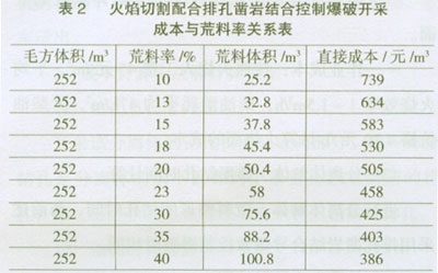 火焰切割機配合排孔鑿巖結合導爆索控制爆破開采,分離體體積、開采荒料率和直接開采成本見表2,開采成本與荒料率的關系見圖4.