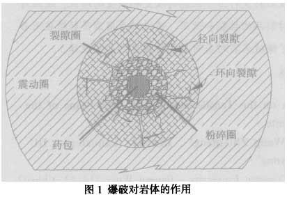 破裂區(qū)的半徑范圍一般為藥包半徑的70一120倍,其特點是徑向裂隙與環(huán)向裂隙交錯分布。破裂區(qū)產生的原因是沖擊波通過壓縮區(qū)后繼續(xù)向外層巖體傳播,衰變?yōu)橐环N弱的、強度低于巖石動態(tài)抗壓強度的壓縮應力波,該波已無法直接壓碎巖石,只能使壓縮區(qū)外層的巖石受到強烈的徑向壓縮、巖石質點產生徑向位移,導致外層巖體的徑向擴張、形成切向拉伸應變。當這種切向拉伸應變超過巖石的動態(tài)抗拉應變值,就在外層巖體中產生了徑向裂隙。另外,壓縮應力波在向外傳播的同時,爆轟氣體開始膨脹并擠人應力波作用形成的徑向裂隙中,引起裂像的進一步擴張,從而在裂隙尖端產生應力集中,導致徑向裂隙繼續(xù)向前延伸。同時,巖體受到通過破裂區(qū)的壓縮應力波的強烈壓縮,儲蓄了部分彈性變形能,在應力波通過后,巖體內的應力釋放會產生與壓縮應力波作用方向相反的向心拉伸應力,使巖石質點產生反向的徑向位移,當這種徑向拉伸應力超過巖體的動態(tài)抗拉強度時,巖體中就會出現(xiàn)環(huán)向裂隙。