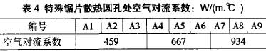 根據文獻的研究,普通鋸片工作時轉速及各部分空氣對流系數:鋸片基體直徑為?350mm,內孔直徑為小?50mm,厚度為2mm,鋸片工作轉速為1000rpm(即鋸片每轉一轉為0.06s);鋸片直徑在[50,  150] mm區間范圍為層流,空氣對流系數約為λ = 9.30 W/(m.℃ ),直徑在[150,  350] mm區間范圍為紊流,空氣對流系數 λ=22.10 W/(m. ℃),窄水口處的空氣對流系數為690 W/(m. ℃),再根據經驗公式可以算得散熱圓孔處空氣對流系數如表4所示。