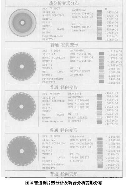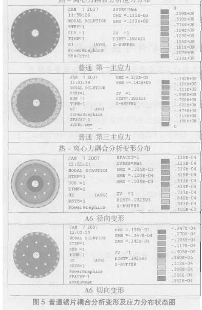 圖4為普通鋸片熱分析和熱一離心力藕合分析變形分布對比,圖5為基體開空冷圓孔鋸片和普通鋸片熱一離心力藕合分析應力及變形分布對比。中國http://www.stonebuy.com石材http://www.stonebuy.com/