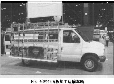 展會展出了一種集成式石材http://www.stonebuy.com/臺面板加工運輸車輛,專門用于半成品、成品臺面板的運輸和簡單的安裝加工,見圖4。