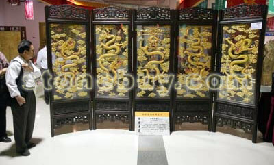 走出大師精品區(qū),還有臺灣館、綜合館、陶瓷展區(qū)、刺繡展區(qū)和石雕展區(qū)。此外,還有永樂宮壁畫、5億龍床。