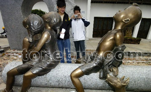 10月30日,長沙市民觀看在安裝中的“月亮粑粑”組雕。當(dāng)日,根據(jù)當(dāng)?shù)孛裰{《月亮粑粑》為依據(jù)創(chuàng)作的花崗巖組雕“月亮粑粑”亮相長沙太平街。