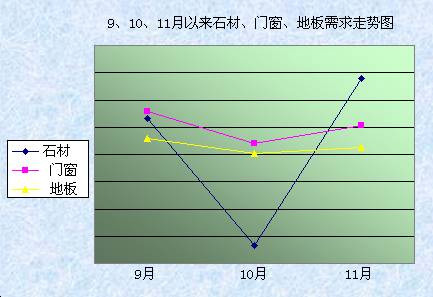 上圖中,石材http://www.stonebuy.com/、門窗、地板在10月有一個下降的走勢,分析原因,與10月的黃金周有關,10月的7天假期會影響建材市場http://www.stonebuy.com/enterprise/FuJian/QuanZhouShi.html的走勢。但整體來看,9月、10月市場http://www.stonebuy.com/enterprise/FuJian/QuanZhouShi.html對門窗的需求要比地板高,石材http://www.stonebuy.com/市場http://www.stonebuy.com/enterprise/FuJian/QuanZhouShi.html不如地板市場http://www.stonebuy.com/enterprise/FuJian/QuanZhouShi.html火,到11月石材http://www.stonebuy.com/有一大幅度升高,成為11月最大的靚點。oacwf.cn