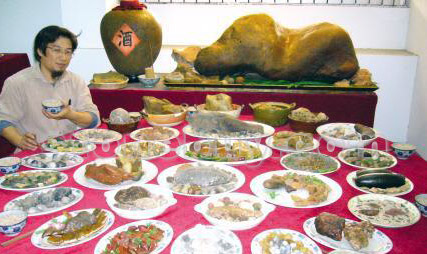 梁永根說,在整理石頭的過程中,他發現很多石頭形色十分像菜肴,后來又在電視上看到“滿漢全席”,就突發靈感:何不用這些酷似菜肴的石頭制作一圍“滿漢全席”?于是,在之后收藏、分揀石頭的過程中,他都有意識地將它們歸類并拼在一起。當然,這些“菜肴”要求都很高,不但大小、顏色要像,而且還十分講究搭配。108道“菜肴”整整跨越了10年,花費了他不少心思,當然也是他最得意的作品。