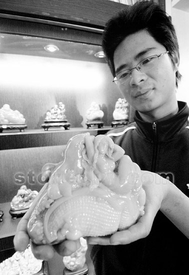 12月7日下午,在福州壽山石展區(qū),記者看到了琳瑯滿(mǎn)目的“田黃”、“芙蓉”、“雞血”等石雕珍品,深得觀(guān)眾青睞,展品中僅“田黃石”就有近600塊。福建http://www.zongyi.com.cn/壽山石協(xié)會(huì)工作人員帶來(lái)一件58克的“田黃石”作品,被沈陽(yáng)一名男子花80萬(wàn)元買(mǎi)走。有關(guān)人士介紹說(shuō),這名男子買(mǎi)走的“田黃石”,質(zhì)地不算太好,稱(chēng)不上“田黃石”中上品,所以才以80萬(wàn)元成交。www.stonebuy.com