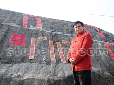 2008年農(nóng)歷正月初三,人們都還沉浸在濃濃的春節(jié)氣氛之中,我和家弟李勁松相約從三和居出發(fā)去漢江支流的堵河下游覓石。上午,我們經(jīng)過尚未完全融化的冰雪,穿越武當山隧道,驅車115公里來到十堰市境內(nèi)的堵河下游,在將要到達最佳覓石點時,勁松發(fā)現(xiàn)了一巨石旁的觀景亭,我放慢了車速,進入眼簾的是,這塊巨石上貼滿了喜聯(lián)。好奇之心油然而生,感到此石非同一般。我立即停車,走進巨石,石上張貼春聯(lián)多為當?shù)孛癖娝鶠椋?lián)語多為自撰自書,如:“石頭干爹保兒平安,吉星普照后世興旺”;“石頭大神神通大,保佑四方都安寧”。一位姓石名楊的人自撰聯(lián)也很有意思:“石楊叩首稱干爹,圣石有靈多朝拜”等等。把巨石稱為“圣石”、“干爹”、“通靈物”。我們不禁生出崇敬之情,立即整衣、沐手“給圣石拜年”。