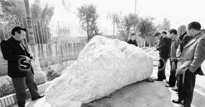 遠遠看去,這塊和田玉就像一塊巨大的淡青色的石頭,并無特別之處,用小鋼錘敲去上面的浮土之后,就能看到它光潔、細膩、凝脂般的軀體。據鄧建新介紹,這塊青白玉長3.75米,寬1.44米,高1.35米,重達11噸。一位玉石專家說,按現在市面上的價格計算,這塊和田青白山材玉的價值至少在6000萬元人民幣以上。