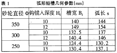根據砂輪直徑與掛鉤錨入短槽深度,按有效長度為80mm計算的弧形短槽幾何參數見表1。