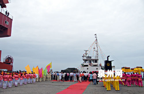 昨天下午近4時,南安http://www.shicai.com.cn/市石井港區(qū)貨運(yùn)碼頭,運(yùn)載鄭成功大型石雕像的“成功17號”貨輪鳴笛起航,人們熱情歡送。