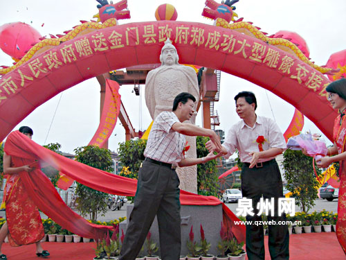 昨天下午3時30分,南安http://www.shicai.com.cn/市政府贈送金門縣政府鄭成功石雕像交接儀式在貨運(yùn)碼頭隆重舉行。交接儀式上,泉州http://www.zongyi.com.cn/市委常委、南安http://www.shicai.com.cn/市委書記駱國清與金門縣長李炷烽共同為鄭成功雕像模型揭彩,南安http://www.shicai.com.cn/市長陳榮法向金門縣長李炷烽遞交鄭成功石雕像文書牌匾。