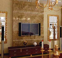 大理石背景墻:古樸的花色符合客廳內的陳設,光滑的表面與如鏡的電視屏幕呼應。