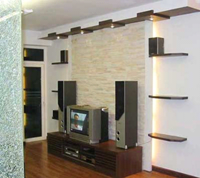 鑲嵌天然文化石的背景墻最為常見,從功能上說,文化石可以吸音,避免音響對其他居室的影響,從裝飾效果上看,它烘托出電器產品http://www.stonebuy.com/sample/金屬的精致感,形成一種強烈的質感對比,十分富有現代感。