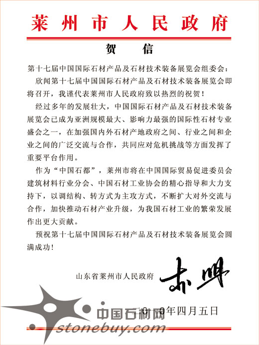 第十七屆中國http://www.stonebuy.com國際石材http://www.stonebuy.com/展于4月6日如期拉開帷幕,上午9:30,在“上海新國際博覽中心”的南大廳舉行了盛大的開幕儀式,各方官員悉數到場。更有未到場的官員從遠方發來賀電,預祝展會圓滿成功。(圖為山東萊州市市長李明從萊州發來的賀信)