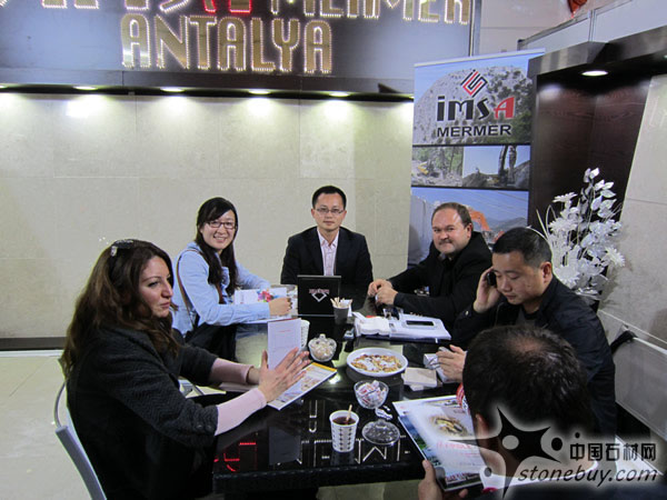 青島國(guó)際石材http://www.stonebuy.com/展工作人員與土耳其客戶交流