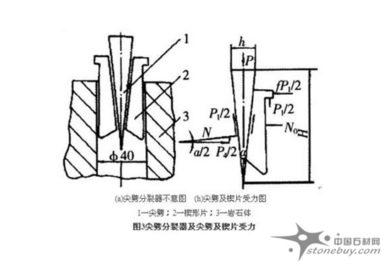 圖3為尖劈分裂器和尖劈及楔片受力圖。如圖3—a所示,與液壓劈裂機活塞相聯的尖劈并不直接劈裂巖石,而是在尖劈兩側還有一對楔形片,即兩楔片夾著尖劈組成一個40mm的圓柱體一分裂器。在預定的巖石分裂線上事先鉆若干ф40mm的孔,然后將分裂器分別插入這些孔內,當液壓劈裂機通人高壓油后即可在上述孔內同時產生劈裂力,致使巖石按預定的位置和方向裂開。