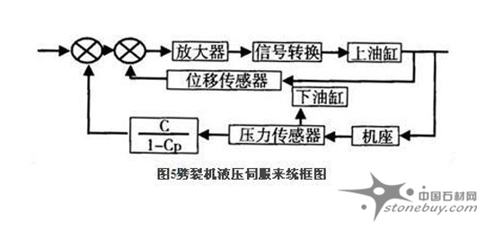 按式(4)算出的QM選取流量伺服閥和液壓缸活塞面積,設計液壓伺服系統,見圖5,其中C為機座自然剛度,場為壓力反饋系數。該系統在刃具快進接近石料時,位移傳感器發出信號,使刃具減速,避免碰撞損耗;在工進時,由裝在機座上的壓力傳感器發出信號,使刃具按一定速度(據被加工石質確定)進給,因而控制了劈裂力的增長速度,減少石材http://www.stonebuy.com/破碎損耗;石料被劈裂后,壓力傳感器及時發出信號,使刃具快退。