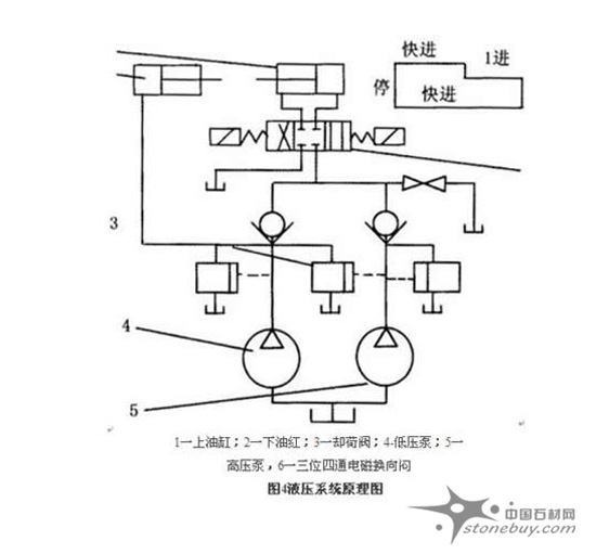該系統作業過程:首先,開動低壓油泵4(此時,電磁閥6斷電,處于切斷上油缸l油路的中位,且上油缸l的活塞此前已處于其上端的極限位置),下油缸2的無桿腔進油,其活塞桿頂起工作臺,使下刃具隱沒,以便將被加工石料置于工作臺上,并對位;按快進電鈕,開動高壓油泵5,并使電磁閥6通電左移,兩油泵同時工作,共同向上油缸l的無桿腔供油,推動上刃具快速下降;當上刃具頂住石料時,高壓泵5的油壓迅速上升室卸荷閥3的調定壓力,閥3啟動,使低壓泵4卸荷空轉,下油缸2的無桿腔回油,工作臺下沉,下刃具頂緊石料,此時僅高壓小流量泵5工作,推動上刃具緩慢工進,對石料施壓,將其劈裂;石料劈裂后,上刃觸發下行程開關(也可按快退電鈕),使電磁閥6右移換向,高壓泵5的壓力迅速降到閥3的調定壓力之下,使其復位;停止卸荷,兩油泵又共同向油缸1的有桿腔供油,使刃具快退,直至觸動上行程開關,使閥6泵5同時斷電,上刃具停在上極限位置,而工作臺又被下油缸2頂起,將被加工好的石料卸下,完成一個工作循環,劈裂機又處于下一工作循環的開始狀態。
