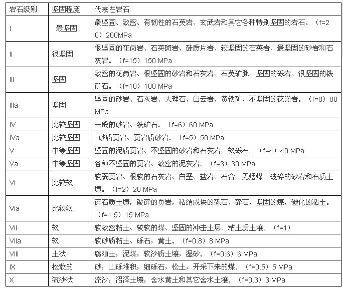 堅固性系數f=R/100(R單位 Kg/cm2) R-巖石標準試樣的單向極限抗壓強度值。如: