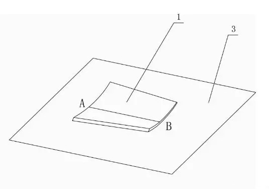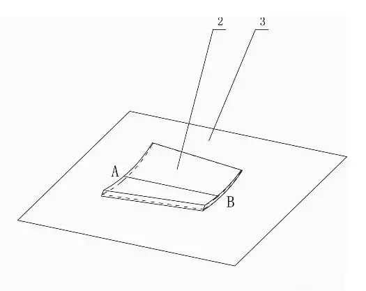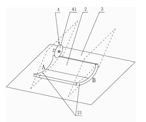 b.修高:如圖3所示, 將圓柱弧板2開口朝上地定位放置于機臺3上, 圓柱弧板2兩側沿到機臺3臺面的距離相等,橋切機4的切刀41刀面偏離豎直平面地切割圓柱弧板2的母線AB方向的兩個端部21, 即橋切機4的切刀41刀面與垂直方向呈一定角度地切割該端部21;兩個端部21的切割面22相互平行, 兩個端部的切割面22的距離與圓錐形弧板1的高度h相等 ;切刀41刀面和垂直方向所成的角度與圓錐形弧板1的高和對應處弧板的母線所成的角度即90-θ 相等 ;