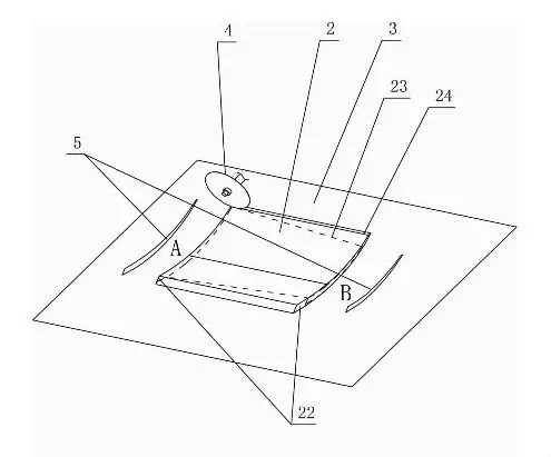 c.切角:如圖4所示, 制作圓錐形弧板1上、 下端面的端面模板5,端面模板5內、外弧中點連線與圓柱弧板2端面的內、外弧的中點的連線重合時,依照端面模板5分別在圓柱弧板2的兩個端部的切割面22上畫出圓錐形弧板1的上、 下端面, 上端面的四個角分別對應與下端面的四個角連線, 根據該連線在圓錐形弧板側壁上畫出切角線23, 橋切機4沿該切角線23切除圓柱弧板2兩側沿24多余部分;