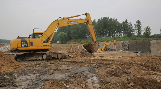 建設(shè)中的春水鎮(zhèn)塔灣河環(huán)保攔污治水工程工地 渣石原料環(huán)保項(xiàng)目