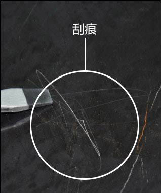 另一種大理石劃痕,比如用鐵釘或尖銳的鐵器將磚面劃破,形成損傷磚面的劃痕。這種地磚劃痕去除后,要修復(fù)一下,否則很快就臟了,重新形成一條黑黑的劃痕印跡。