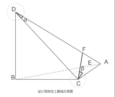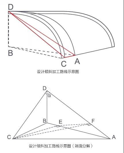 圖中 DB、BC 為弦長;CD 為弧板弦長,AD為斜切后弦長,CA為弧板順高度切除的最大尺寸。可見:∠CDA 就是以弧板底面定位時的工作臺轉角α,∠FCE為扳刀角 β: