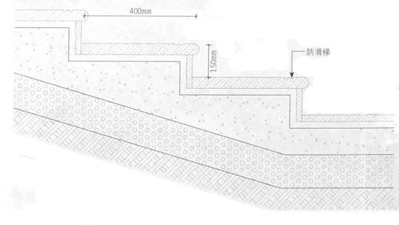 在表達(dá)臺(tái)階設(shè)計(jì)節(jié)點(diǎn)時(shí)我們通常的做法是畫一個(gè)標(biāo)準(zhǔn)的臺(tái)階斷面圖通用到整個(gè)項(xiàng)目里面去,如圖1-1所示,然而臺(tái)階與相鄰側(cè)墻立面有無關(guān)系沒有任何節(jié)點(diǎn)表示。