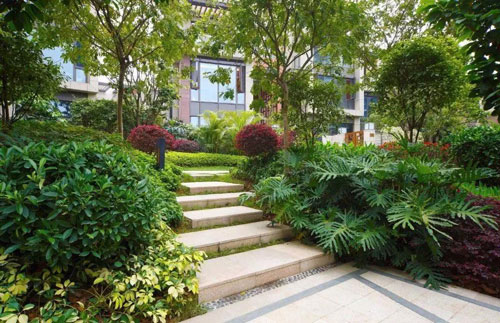 利用景石或者灌木收邊的形式將臺(tái)階做一個(gè)收頭處理。景石擺放時(shí)注意與臺(tái)階要有咬合,