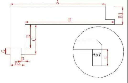 二、 非標窗臺石面積=臺面石實際投影面積+下檔水沿面積 磨邊長度=下擋水沿長度