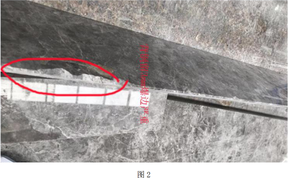 圖2是深圳東塔公寓項目云朵拉灰背倒加工的產品http://www.stonebuy.com/sample/。由云朵拉灰石材http://www.stonebuy.com/屬于發散性裂紋的材料,從圖2中看出即使留3mm的平臺依舊崩邊嚴重。鑒于這種情況,該項目又將背倒留3mm改成了留5mm。