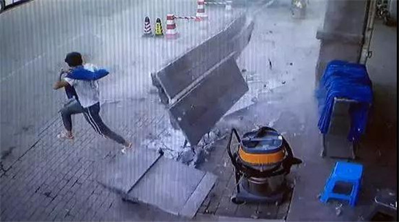 (湖州長興縣的一家洗車店店鋪上方的外墻大面積脫落,直接砸向地面,下方的店員抱頭跑開,逃過一劫。整個過程不到1秒鐘)