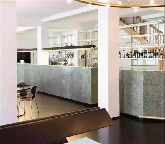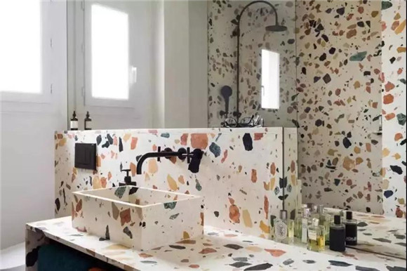 水磨石在墻面,家居及臺面等部分的應用上,主要運用的是預制板材干掛、粘貼(膠粘+濕貼)的工藝,我們可以感受一下實際應用的案例: