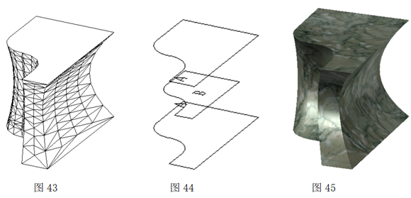 圖40是用圖41中的大小不同的兩個截面圖形A與B經(jīng)過放樣命令形成的線框圖;圖42是貼材質(zhì)后的效果圖。