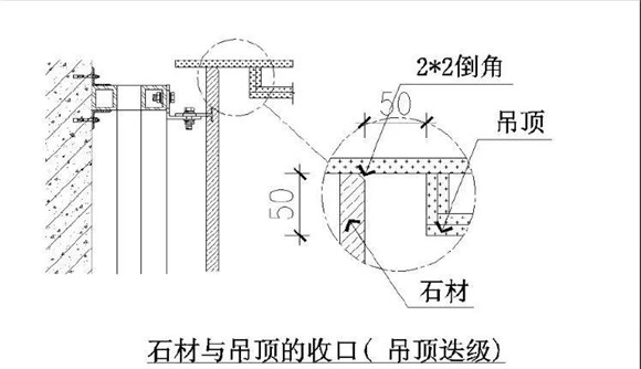 4、吊頂設置凹槽:吊頂周邊設置迭級或凹槽,墻面石材http://www.stonebuy.com/直接置頂,同時墻面頂端石材http://www.stonebuy.com/正面以2mm*2mm的45°倒角。