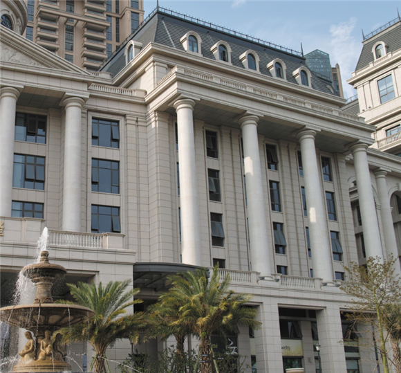 花崗巖色調鮮明、莊重大方,許多建筑都選用了花崗巖作為墻面裝飾。