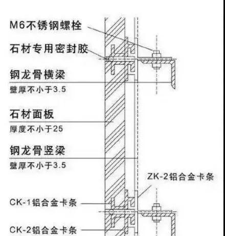 通槽式掛法一般采用鋁合金SE組合掛件(部分采用T型或蝶形掛件),在每塊石板上下邊開通長槽,槽深度小于15mm,開槽寬度宜為6mm,掛件厚度大于4mm。