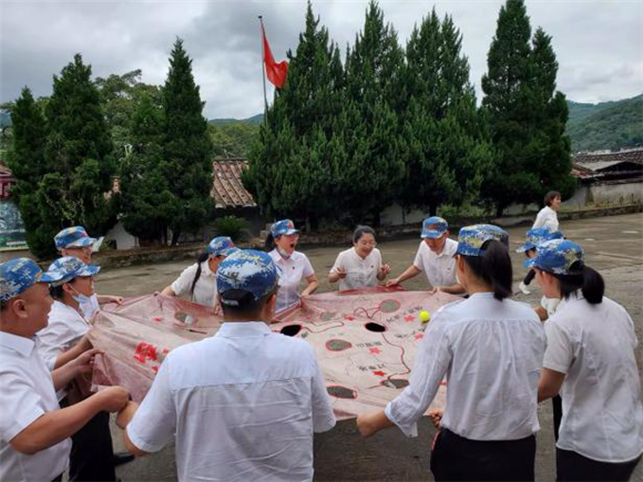 團隊成員一起參與,將“中央紅軍長征路線圖”畫布拉平。教練在“瑞金”地點放置一網球,代表中央紅軍。