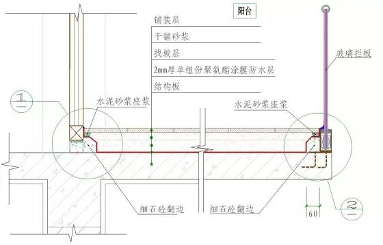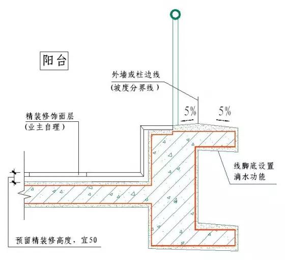 1、陽臺上翻梁與外線條分別設內外排水坡;