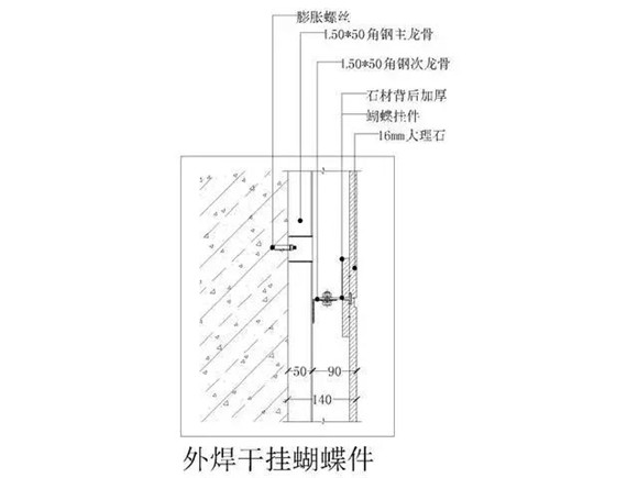 ◆輔材:a.不銹鋼膨脹螺絲,b.不銹鋼蝴蝶掛件,c.云石膠,d.干掛AB膠;