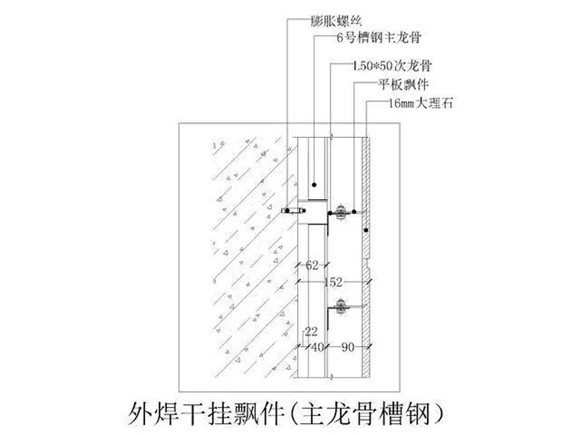 ◆輔材:a.不銹鋼膨脹螺絲,b.不銹鋼干掛飄件,c.云石膠,d.干掛AB膠,6#槽鋼主龍骨及∠50角鋼次龍骨;