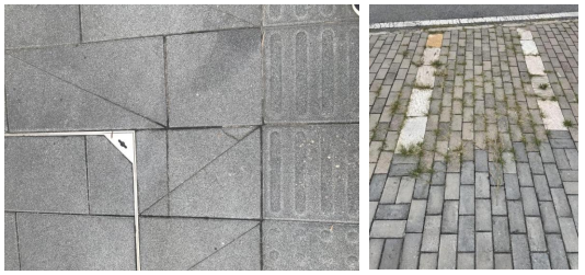 用“PC”磚鋪貼的市政道路可以說極其臟,嚴重影響了一個城市的市容市貌,不僅沒有起到裝飾城市的作用,相反使城市的市容市貌相當丑陋。圖5與圖6的“PC”磚能夠清洗干凈嗎?筆者認為是不可能的,即使可以清洗干凈其成本可能高于“PC”磚本身的價格了,意義不大了。