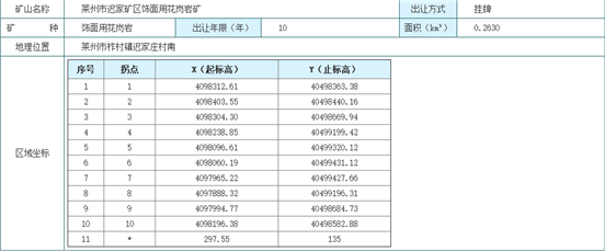 三、出讓采礦權基本情況 項目名稱:萊州市遲家礦區飾面用花崗巖礦 開采礦種:飾面用花崗巖 地理位置:萊州市柞村鎮遲家莊村南 面積:0.263平方千米,拐點坐標如下(2000國家大地坐標):
