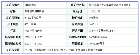 新干縣城上鄉豐樂普通建筑用花崗巖礦位于新干縣城110°方位直距約30公里處,行政區劃隸屬新干縣城上鄉管轄,礦區中心地理坐標:東經115°41′24″,北緯27°41′16″。開采標高:+435米至+160米;面積:0.4859平方公里;開采礦種:普通建筑用花崗巖;開采規模:600萬噸/年;開采年限:15.5年(含基建期1.5年);資源儲量:10593.699萬噸。起始價:11000萬元,(無底價掛牌)。