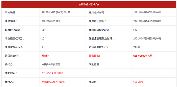 據惠州市公共資源交易中心成交信息顯示:5月14日,由博羅縣自然資源局委托該中心掛牌的一宗編號為BLKCXS202101號,儲量506029立方米的建筑用花崗巖礦完成前期公示順利成交,中航建筑工程有限公司以615萬元底價競得位于中洲半島城邦項目建設場地內的該礦山開采權,平均競得資源單價12.2元/立方米。