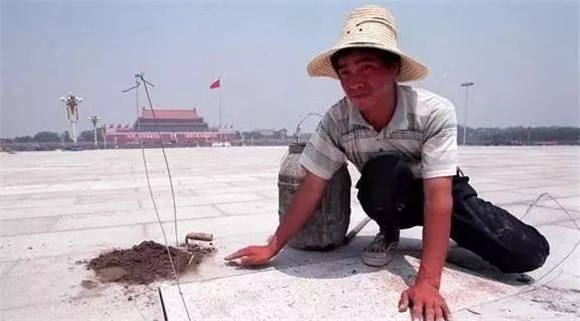 1999年6月18日,北京城建集團的4名工作人員一起將整個廣場最后一塊石磚精準地放入指定位置——從廣場西草坪東南角向東數第5塊花崗石磚位置。